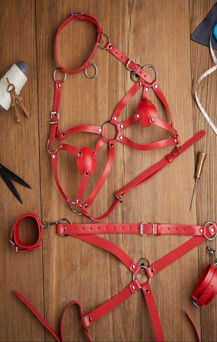 Kırmızı Deri Harness Kalp Detaylı Boyunluklu Hard Bileklikli Ultra Fantezi Kostüm