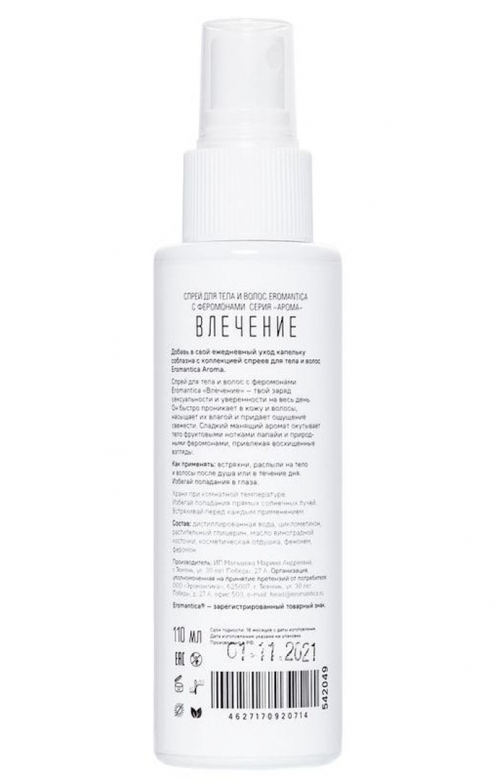 Eromantica'nın özel formülüyle hazırlanan Attraction Vücut ve Saç Spreyi, kendine güvenen ve çekici hissetmek isteyenleri hedefleyen bir üründür. Bu sprey, taze ve çekici bir koku ile cildinizi ve saçlarınızı sararak sizi tüm gün boyunca enerjik ve çekici hissettirir. Çekici ve Etkileyici Koku: Attraction, özel bir karışımıyla çekici ve etkileyici bir koku sunar. Bu benzersiz koku, hem cildinizde hem de saçlarınızda uzun süre kalıcıdır. Çift Kullanım: Vücut ve saçlarda kullanılabilen bu sprey, cildinizi taze ve hafif bir hisle sararken, saçlarınıza da hoş bir koku bırakır. Duştan sonra veya gün boyu çalkalayıp vücudunuza ve saçınıza püskürtün. Gözlerle temasından kaçının. Doğrudan güneş ışığından uzakta, oda sıcaklığında saklayın. Her kullanımdan önce çalkalayın. 110 ml Şık Ambalaj: Taşınabilir ve şık ambalajıyla Attraction, günlük kullanım ve seyahatler için ideal bir boyuttadır. Uyumlu İçerik: Cilde ve saça uyumlu olan formülü sayesinde, Attraction sprey cildi kurutmadan nemlendirir ve saçları canlandırır. Güvenilir ve Kaliteli: Eromantica markası, güvenilir ve kaliteli ürünleriyle bilinir. Attraction Vücut ve Saç Spreyi de markanın bu standartlarını yansıtarak kullanıcılarına özel bir deneyim sunar. Eromantica Attraction Vücut ve Saç Spreyi ile çekiciliğinizi vurgulayın, enerjinizi artırın ve güzellikteki anları öne çıkarın. Kendinizi özel hissetmek için mükemmel bir tamamlayıcıdır. İçindekiler: damıtılmış su, siklometikon, zeytinyağı, gliserin, kozmetik parfüm, koku sabitleyici, sharomix, polisorbat, feromonlar, TWIN-80. Menşe ülke: RUSYA.