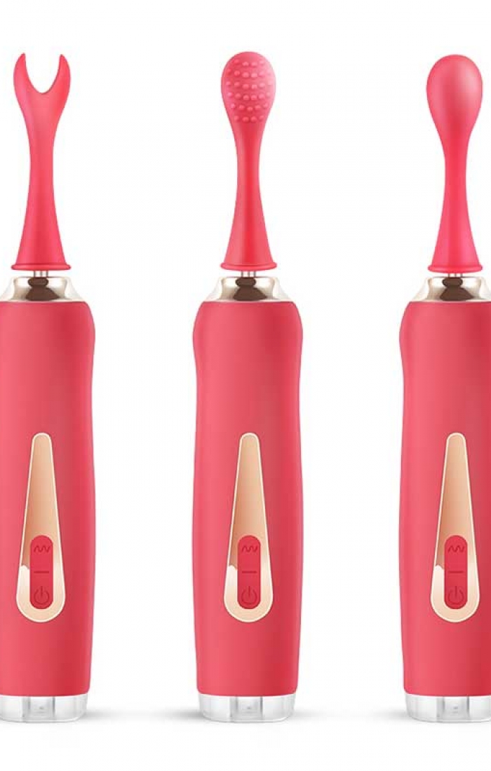Üç Başlıklı Değiştirilebilir Vibratör Kırmızı 18*3.4 cm boyutlarındadır. 3 farklı hız ve 7 farklı titreşim mdou vardır. USB kablo ile şarj edilir..